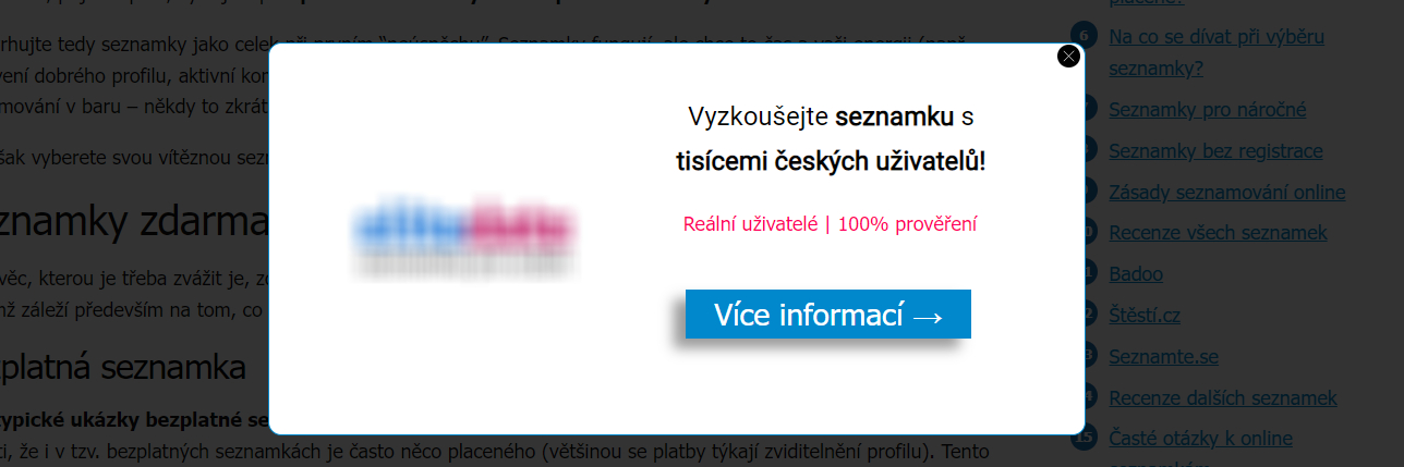 Některé srovnávače vám při opouštění webu na obrazovku vyhodí vyskakovací okno. A v něm se objeví pobídka k registraci na jedné konkrétní seznamce. Opravdu by tohle dělal nestranný srovnávač? Těžko…